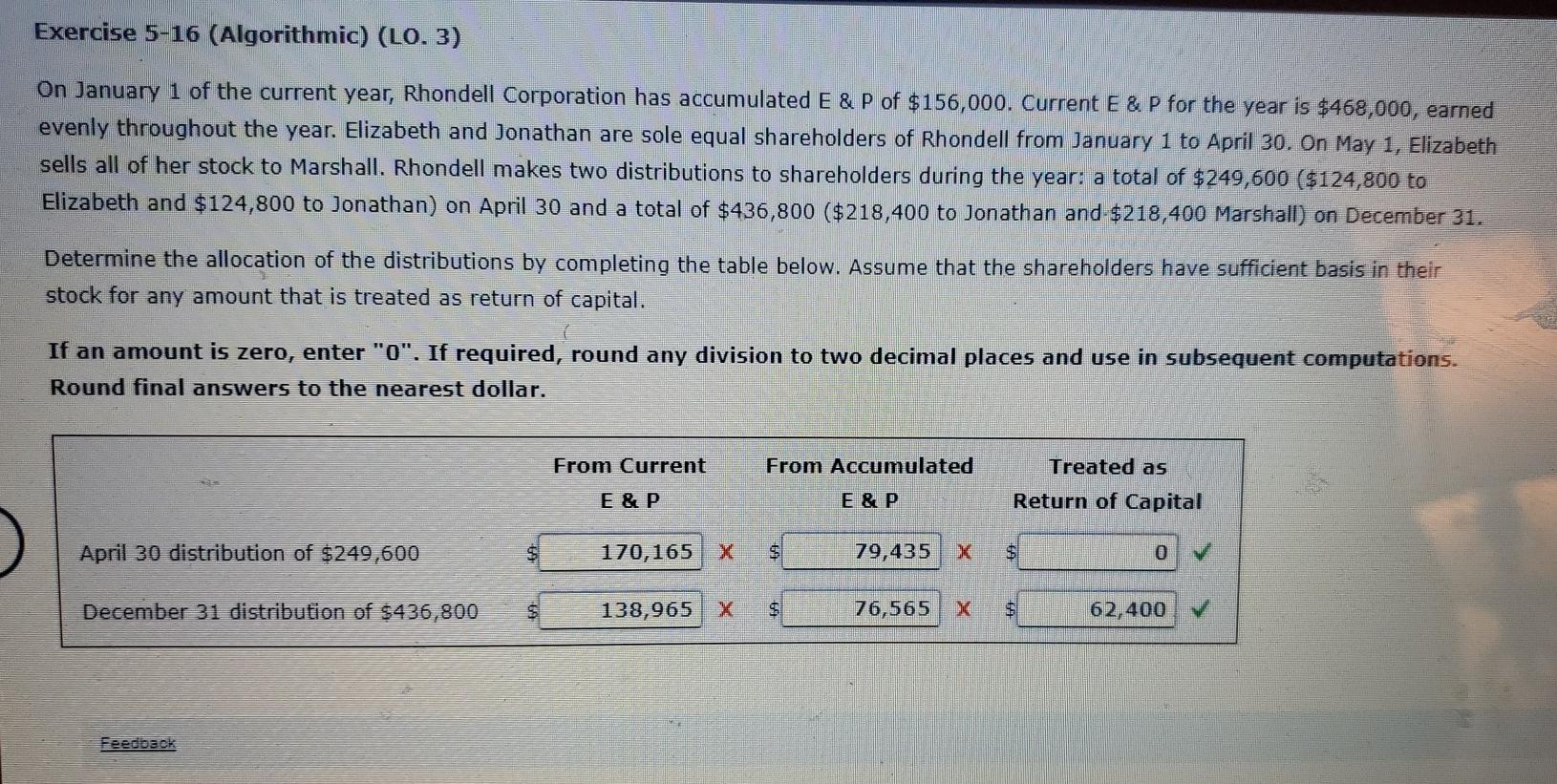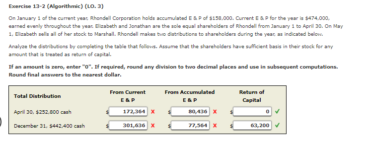 Elizabeth and Jonathan are sole equal shareholders of Rhondell from January 1 to April 30. Elizabeth and Jonathan are sole equal shareholders of Rhondell from January 1 to April 30. On January 1 of the current year Rhondell Corporation holds accumulated E P of 13000.