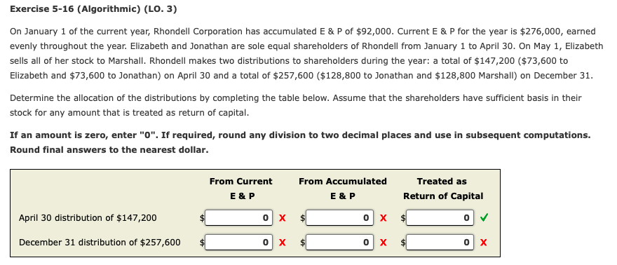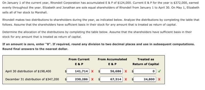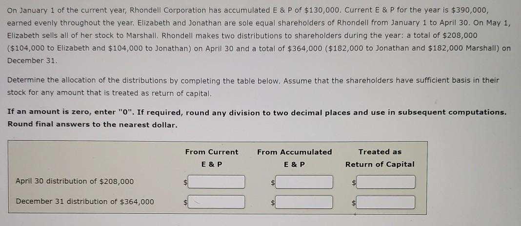 Current E P for the year is 114000 earned evenly throughout the year. Elizabeth and Jonathan are sole equal shareholders of Rhondell from January 1 to April 30. On January 1 of the current year Rhondell Corporation has accumulated E On January 1 of the current year Rhondell Corporation has accumulated E P of 13000.
