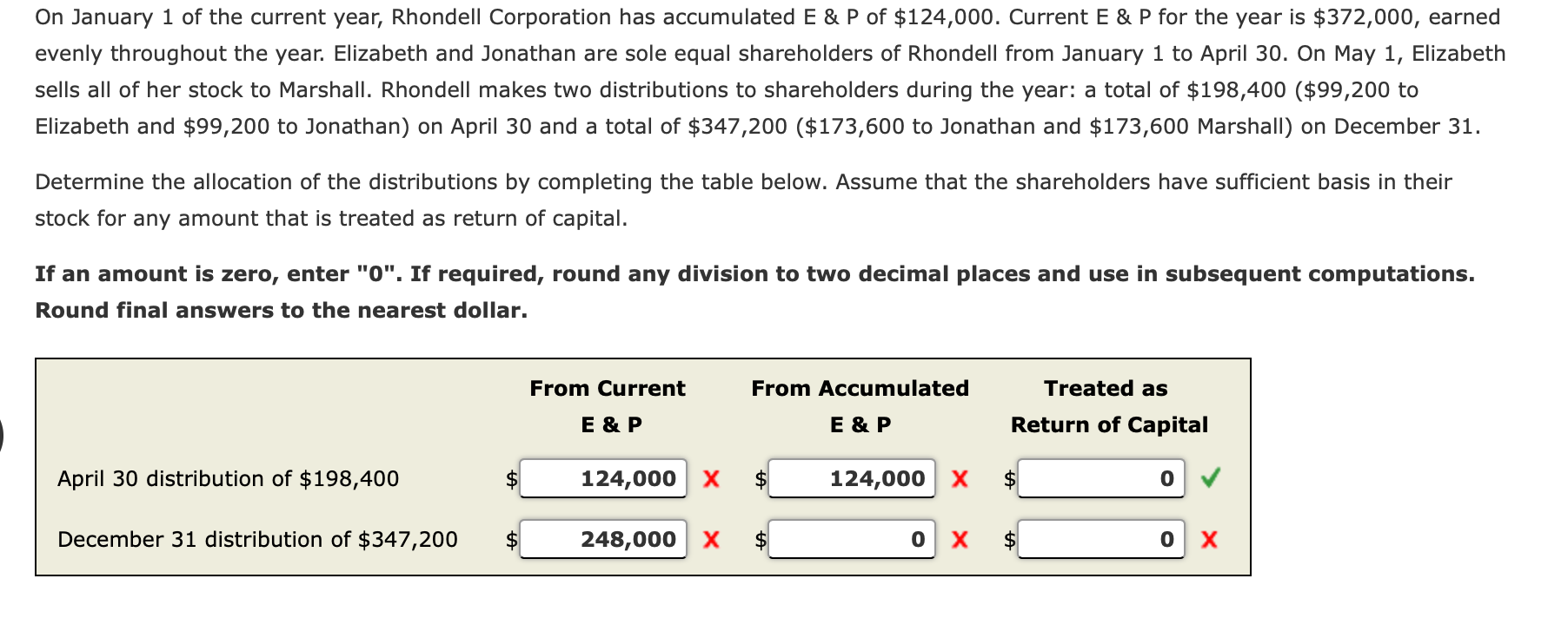 Elizabeth and Jonathan are sole equal shareholders of Rhondell from January 1 to April 30. On January 1 of the current year Rhondell Corporation has accumulated E P of 13000. On May 1 Elizabeth sells all of her stock to Marshall.